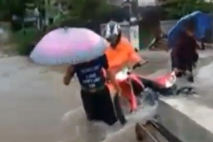 Sayangnya pemotor tersebut tidak menyadari, bahwa arus banjir saat itu cukup deras.