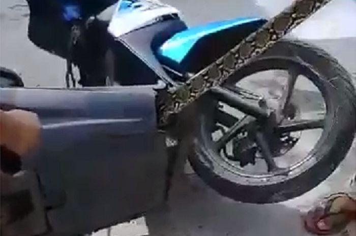 Walaupun sempit dan pengap, ular sanca nampak nyaman bersarang di bagian bawah skutik mungil Honda ini.