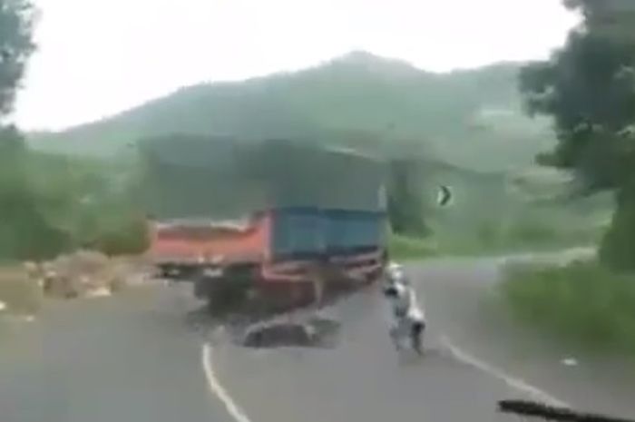 Mungkin kaget melihat kedatangan sebuah truk dari arah berlawanan, pemotor ini terjatuh tepat di depan truk tersebut.