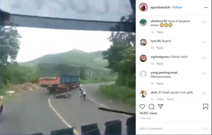 Kejadian ini terekam oleh pengendara truck dibelakangnya dan diunggah di akun IG @agoezbandz4 pada Jum'at (28/02/2020) kemarin.