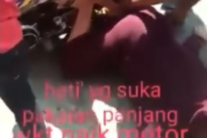 Dalam video tampak seorang wanita yang tergeletak di aspal, sementara sejumlah orang berusaha melepas kain yang terlilit roda motor.