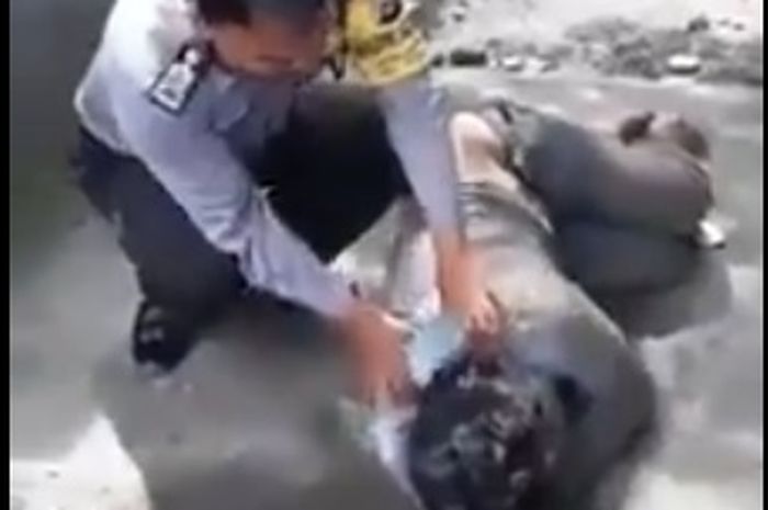Petugas dari Bhabinkamtibmas Polsek Jogoroto dengan cekatan langsung memberikan bantuan pijatan.