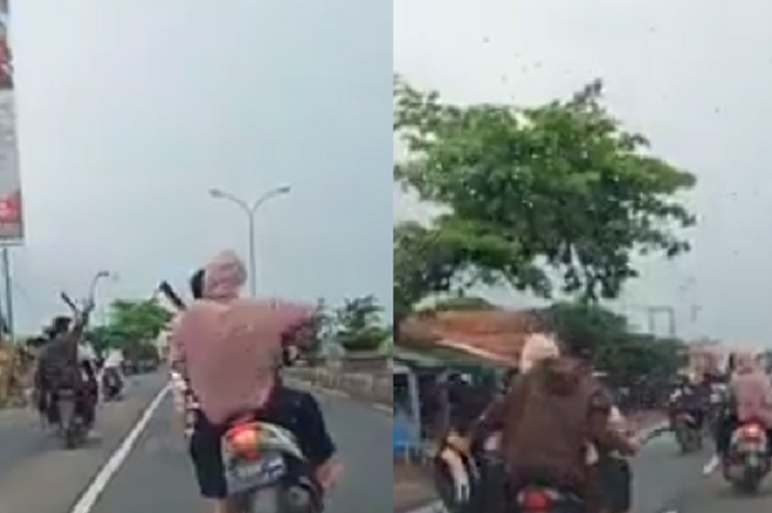 Enggak cuma ugal-ugalan, yang bikin ngeri mereka juga mengangkat-angkat celurit, seperti ingin tawuran.