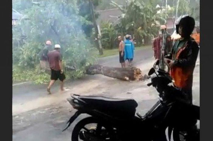 Gridmotor.id - Angin kencang disertai hujan deras pada Senin (2/3/2020), Pohon asem berdiameter sekitar 50 meter itu tumbang akibatnya emak-emak terjungkal naik motor.