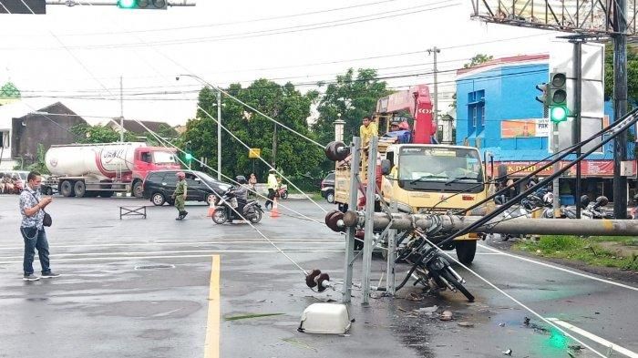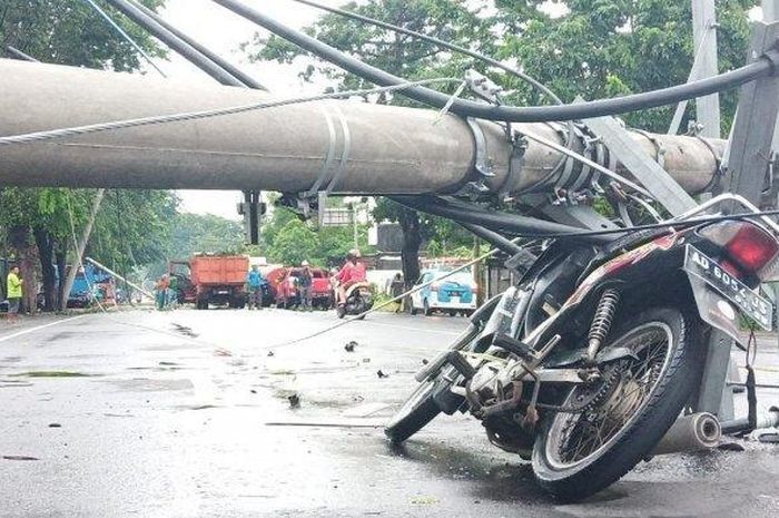 Gridmotor.id - Seorang pengendara motor tertimpa pohon dan tiang listrik roboh di Jalan Mangun Sarkoro Kelurahan Sumber, Kecamatan Banjarsari, Solo, dekat kawasan kediaman Presiden Jokowi, Jumat (6/3/2020).