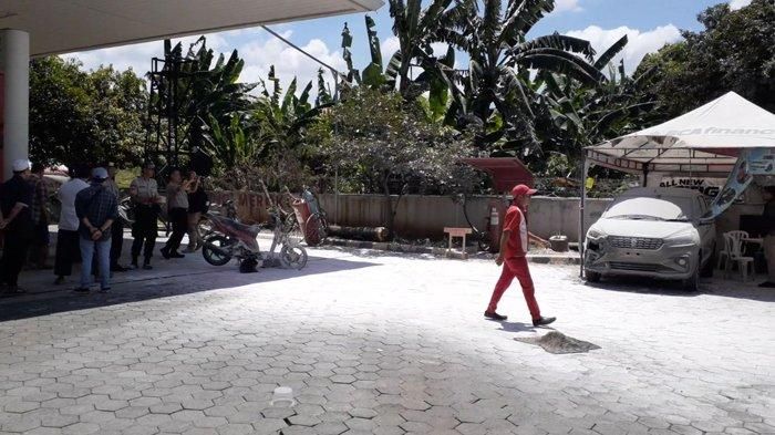 Saat itu salah satu pengendara motor matic berwarna merah hitam sedang mengisi bensin.