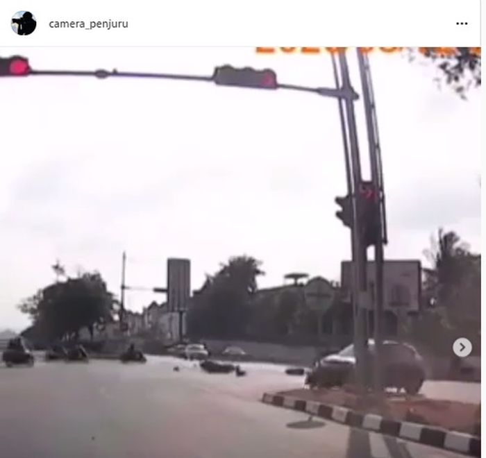 Brak!! sepeda motor ini pun langsung menabrak Honda CR-V sang pengemudi motor terlontar dari motornya, laju mobil semakin tak terkendali dan akhirnya menabrak 1 pemotor lainnya.