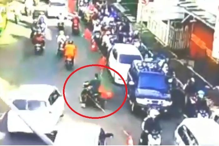 Gridmotor.id - Kelakuan bar-bar memperlihatkan seorang pemuda yang sedang naik motor menerobos traffic cone gara-gara ada polisi di depannya.