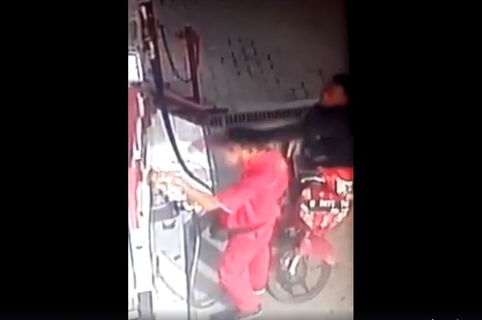 Terlihat petugas SPBU yang sedang memencet tombol takaran bensin di dispenser SPBU tiba-tiba dianiaya pemotor.