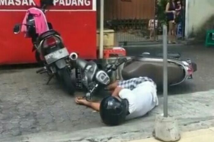 Sebab, Pemgendara motor ini tiba-tiba terjatuh dari motornya dan mengalami kejang-kejang.