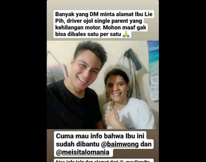 "Banyak yang DM minta alamat Ibu Lie Pih, driver ojek online single parent yang kehilangan motor. Mohon maaf gak bisa dibalas satu persatu."