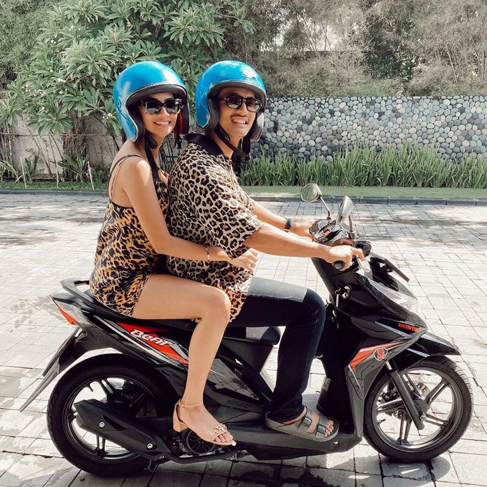 Saat itu, keduanya menunggang Honda BeAT dengan busana matching couple bermotif totol kulit macan.