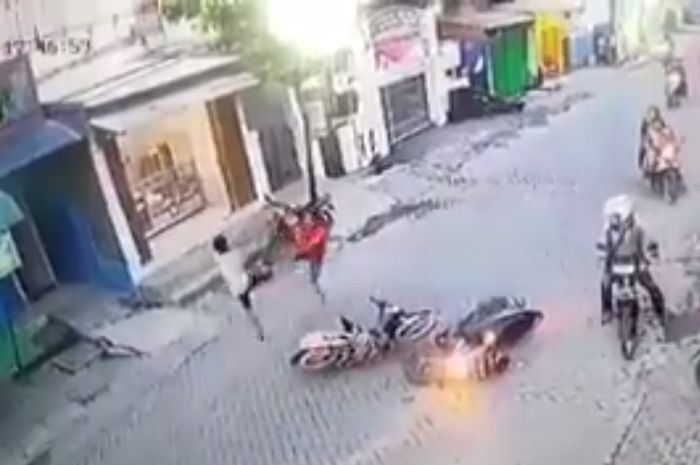 ABG yang berbaju merah mengendara motor matic putih seperti sengaja menabrak motor matic warna hitam yang dikendarai ABG baju putih.