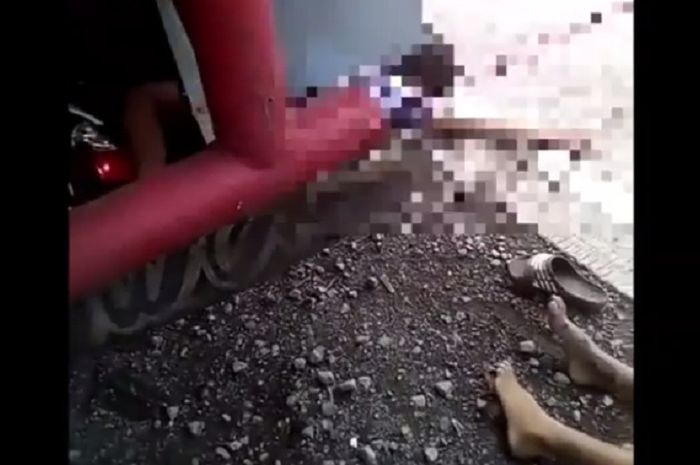 Lalu terlihat sebuah motor yang ditengarai dikendarai ketiga bocah tersebut tersangkut di kolong truk dengan posisi mesin masih menyala.