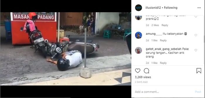 Dalam video berdurasi singkat ini terlihat tanpa sebab seorang pemotor tiba-tiba terjatuh dan tergeletak tepat di parkiran depan rumah makan padang.