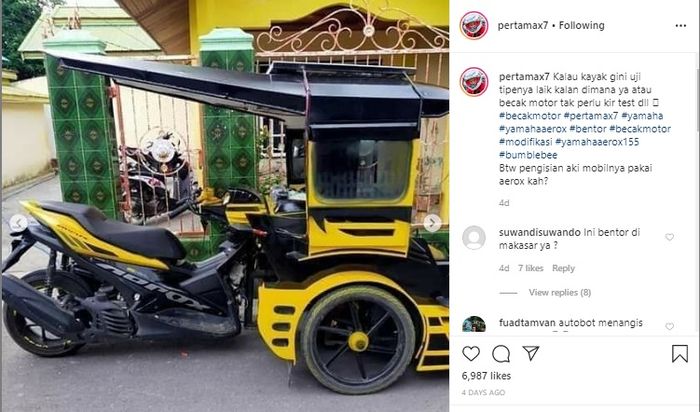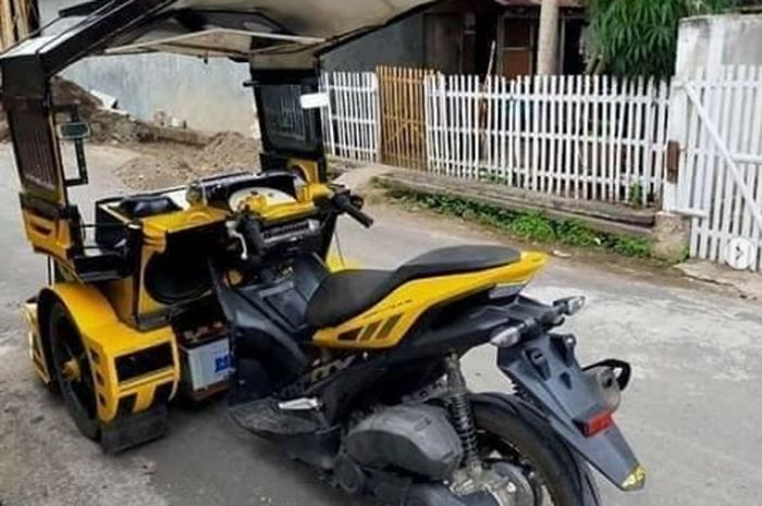 Kali ini Yamaha Aerox 155 dibuat khusus memiliki roda sebanyak 3 buah dan berdesain mirip pahlawan Transformer yaitu sosok Bumble Bee serta memiliki atap layaknya sebuah mobil.