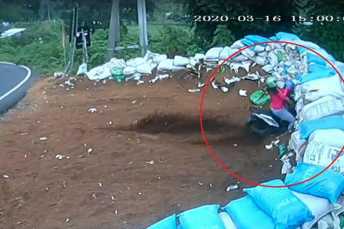 Dalam video terlihat pada jam 14.59 pengendara yang menggunakan motor merah lurus di tikungan dengan kondisi masih bisa mengerem dan tetap nyusruk.