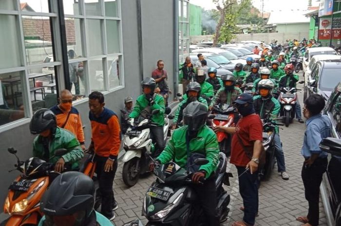 Gridmotor.id - Ada sekitar 500 driver ojek online (ojol) yang mengantre disemprot desinfektan untuk mencegah penyebaran virus corona.