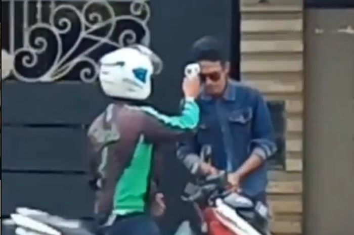 Gridmotor.id - Seorang driver ojol (ojek online) terekam kamera sedang memberikan hand sanitizer dan mengecek suhu badan penumpangnya.