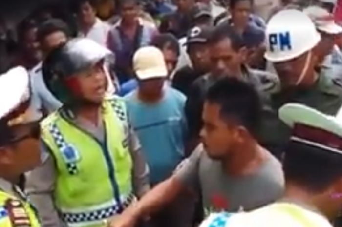 Keributan antara pria yang tidak mau ditilang dengan polisi ini menimbulkan perhatian warga.