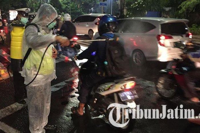 Dilansir dari TribunJatim.com, terlihat sejumlah pengendara roda dua berusaha menepi agar terkena penyemprotan disinfektan itu.