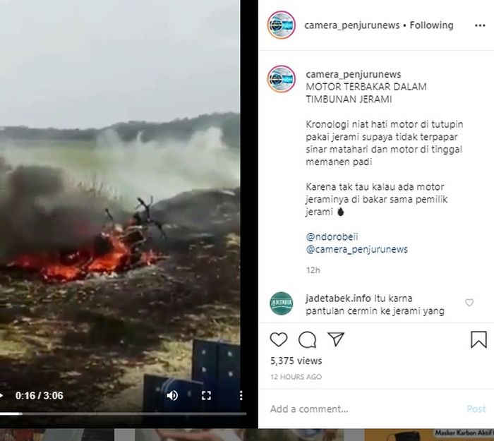 Ternyata tumpukan jerami yang digunakan untuk menaruh 2 buah motor tadi dibakar oleh sang pemilik jerami.