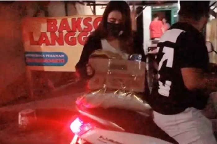 Via yang mengenakan masker hitam terlihat memberikan satu karung beras, satu dus mi instan, minyak goreng, dan beberapa sembako lain kepada warga.