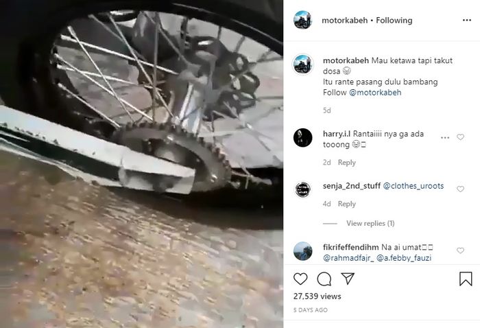 Akhirnya tawa pun pecah saat sang pemilik menyadari bahwa rupanya rantai motornya hilang alias tidak ada.