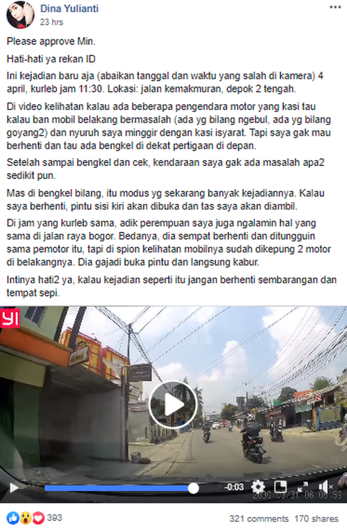 "Di jam yang kurleb sama, adik perempuan saya juga ngalamin hal yang sama di jalan raya bogor. Bedanya, dia sempat berhenti dan ditungguin sama pemotor itu, tapi di spion kelihatan mobilnya sudah dikepung 2 motor di belakangnya. Dia gajadi buka pintu dan langsung kabur.