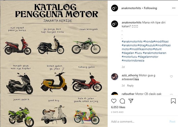 Sebuah katalog berisi gambar-gambar motor beserta tipe pengendaranya diunggah di Instagram @anakmotorhits (03/04/2020).