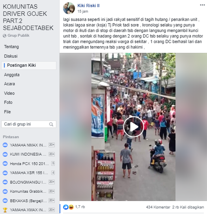 "lagi suasana seperti ini jadi rakyat sensitif di tagih hutang / penarikan unit, lokasi lagoa sinar (koja) Tj Priok tadi sore, kronologi selaku yang punya motor di ikuti dan di stop di daerah tsb dengan langsung mengambil kunci unit tsb, sontak di hadang dengan 2 orang DC tsb selaku yang punya motor triak dan mengundang reaksi warga di sekitar, 1 orang DC berhasil lari dan meninggalkan temennya tsb yang di hakimi," tulis Kiki pada postingan tersebut.