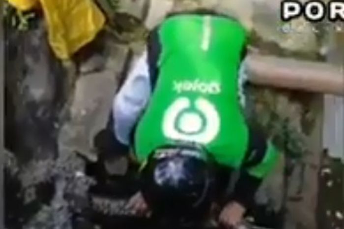 Terlihat seorang driver ojol tiba-tiba langsung nyebur ke dalam parit.