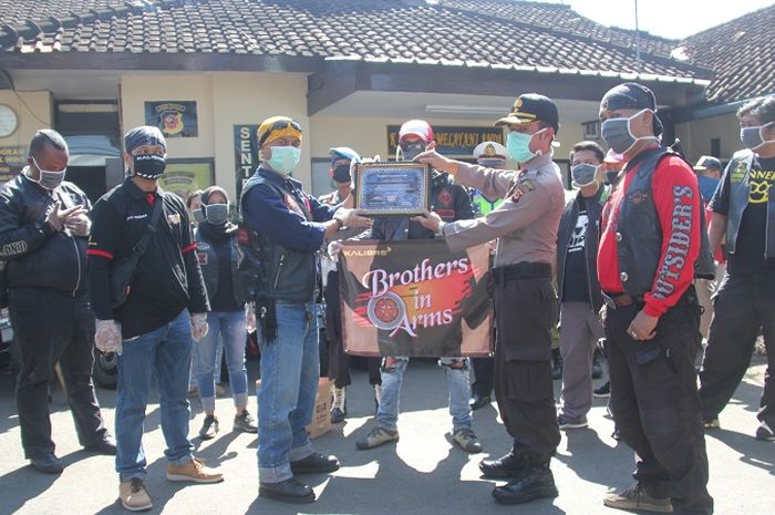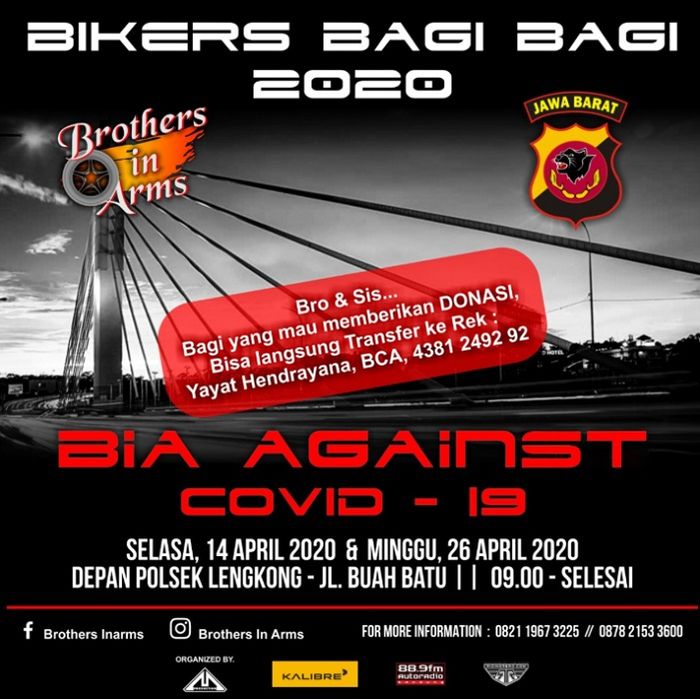Tim BROTHERS IN ARMS beserta club-club Motor Bandung (Bikers Brotherhood MC, MMC Outsiders, MACI, Cosanostra, Harley Owner Group, Southland Family, Trabas, R15, Scorpio Adventure Bandung, Sky Wave Turbomatic, Brothers Sportbike, CBBMC, Satudarah MC, Saudarah, HPCI, YVCB, Mosty Extreme Cimahi, etc.) sepakat untuk melakukan kegiatan Bakti Sosial bertema "BIA AGAINST COVID – 19".