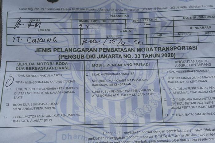 Gridmotor.id - Beredar surat tilang bagi pelanggar Pembatasan Sosial Berskala Besar (PSBB) di Jakarta.