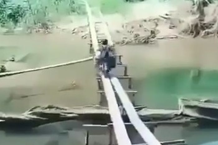 Gridmotor.id - Skill tingkat dewa!, seorang pemotor sebrangi sungai hanya lewat sebatang kayu, lengkap dengan jerigennya.