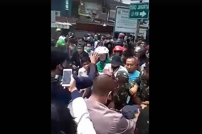 Terlihat dua pria berada di dalam mobil digebukin oleh massa tanpa ampun terlihat juga driver ojol mengerumini keributan itu.
