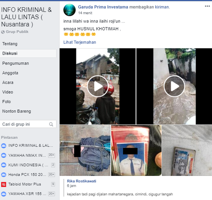 Salah satunya, diunggah oleh pemilik akun Facebook Rika Rostikawati, dan dbagikan oleh Garuda Prima Investama ke grup FB INFO KRIMINAL & LALU LINTAS (Nusantara).