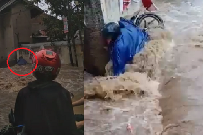 Dalam video tersebut, terlihat pengendara yang mengenakan jas hujan biru itu memaksakan motornya menerjang arus banjir yang deras.