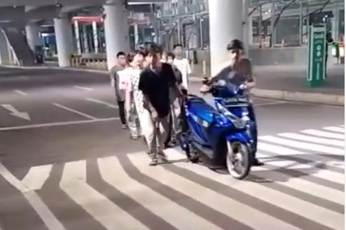 Motor Honda BeAT yang dibawa juga harus dituntun oleh para remaja tersebut.