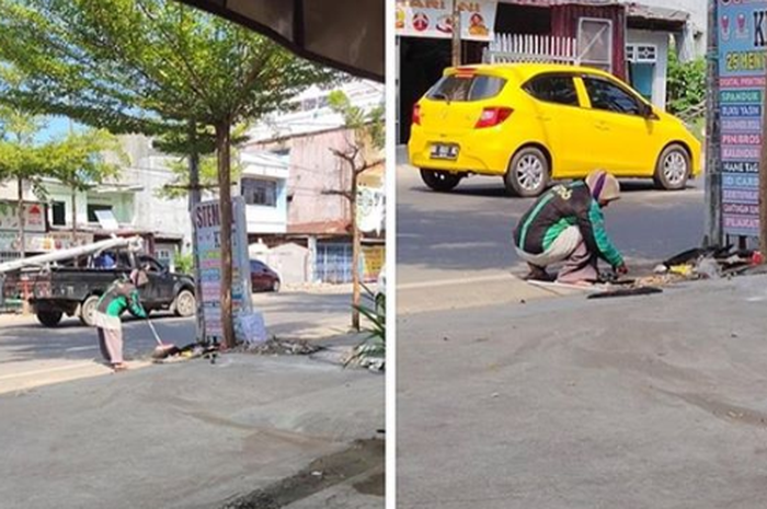 Pada gambar yang diunggah, terlihat seorang wanita mengenakan atribut ojol sedang menyapu di pinggir jalan raya.