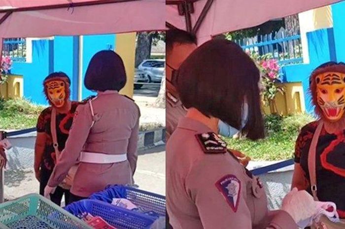 Seorang emak-emak memakai topeng harimau sebagai pengganti masker saat bayar pajak di Kantor Samsat Medan, Sabtu (18/4/2020).