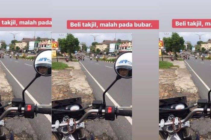 Tulisan itu terlihat jelas dihelmnya yang mantul dari kaca spion motor.