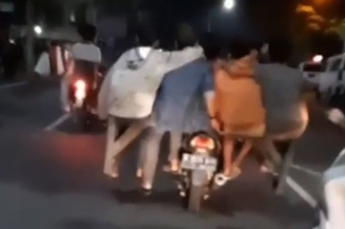 Ternyata salah satu pemotor tampak memasang kursi panjang di jok belakang untuk mengangkut 4 orang penumpang sekaligus.