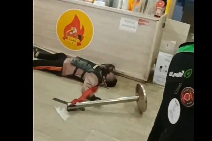 Dalam video yang diunggah akun Twitter @RomitsuT itu terlihat sang driver ojol tersebut tergeletak persis di depan meja kasir restoran.