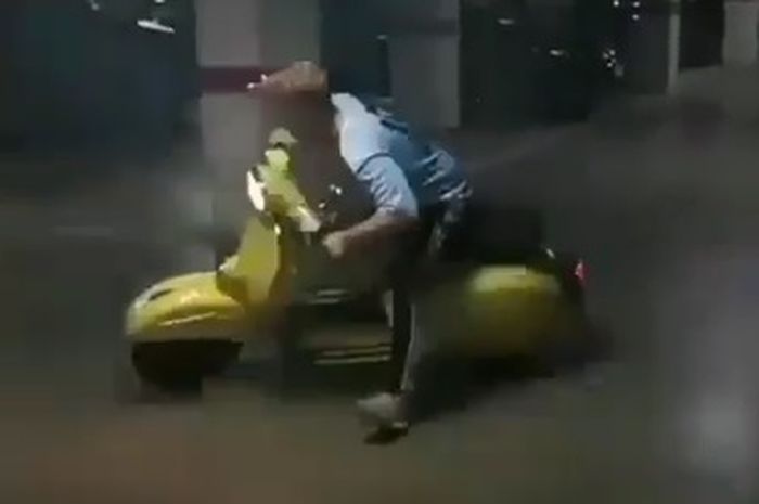Kali ini ada yang tak biasa, aksi drifting dilakukan dengan menaiki motor Vespa.