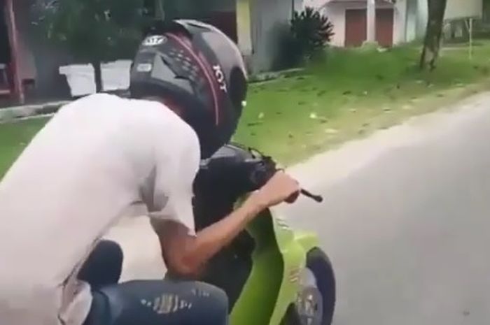 Dengan menggunakan helm full face, ia berlaga seperti mengendarai motor dengan kecepatan tinggi ala MotoGP, karena saat awal video belum terlihat polisi yang membantu.