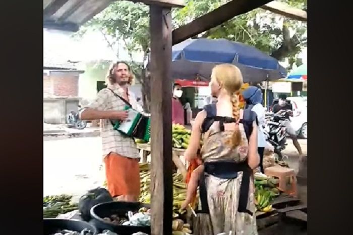Viral video satu keluarga asal Rusia, ngamen di Pasar Tradisional Kebon Roek, Mataram, Nusa Tenggara Barat.