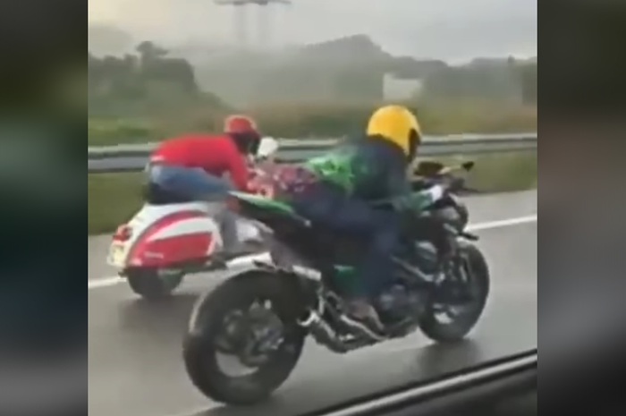 Terlihat balap liar terjadi di bahu jalan tol.