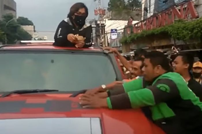 Terlihat Yuni Astuti keluar dari sunroof mobil warna merah Hammer dan membagikan uang.
