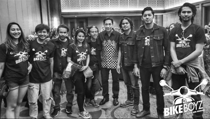 Gariz Luis terlihat juga bersama kru film lainnya menggunakan koas hitam yang bertuliskan Bike Boyz.
